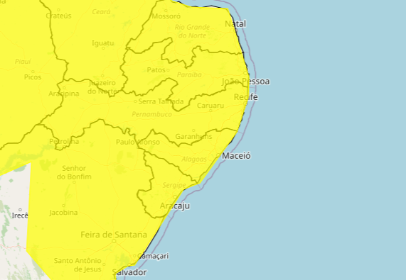 Além de Alagoas, os outros oito estados do nordeste, mais federações do Sudeste, Centro-oeste e Norte, estão sob alerta amarelo do Inmet.